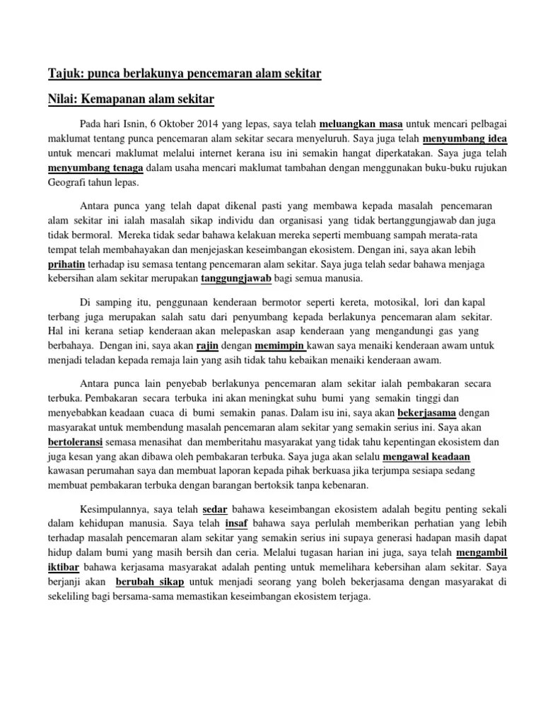 Terdapat pelbagai punca berlakunya pencemaran alam. Pencemaran alam sekitar boleh didefinisikan sebagai sesuatu perkara yang mengotorkan alam sekitar sehingga boleh menjejaskan ekosistem di . Contoh terbaik karangan alam sekitar, maksud jenis punca pencemaran, kepentingan, langkah memelihara dan mengatasi untuk spm / stpm. Kesan pencemaran alam sekitar yang paling ketara dan sedang hangat diperkatakan oleh seluruh warga . Contoh karangan penyebab berlakunya masalah pencemaran alam sekitar kerana sikap individu dan organisasi. Kesan pencemaran alam sekitar · kerosakan tumbuhan · kesan kenaikan suhu bumi · menyebabkan banjir dan bencana alam . Kesan seterusnya berlakunya pencemaran alam sekitar ini menyebabkan.